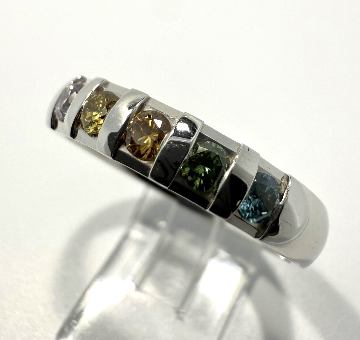Einzigartiger Ring im Memoire- Design. In Weißgold 750 Karat, hochglanzpoliert und mit Rhodium veredelt. Geschmückt mit seltenen Diamanten in den Farben des Regenbogens. In unvergleichlicher Schönheit und besonderem Feuer. Fünf Diamanten Blau: Intensive Blue (behandelt) Grün: Fancy Yellow Green (behandelt) Orange: Deep Yellowish Orange (Natur) Gelb: Fancy Vivid Yellow (Natur) Grau: Light Gray