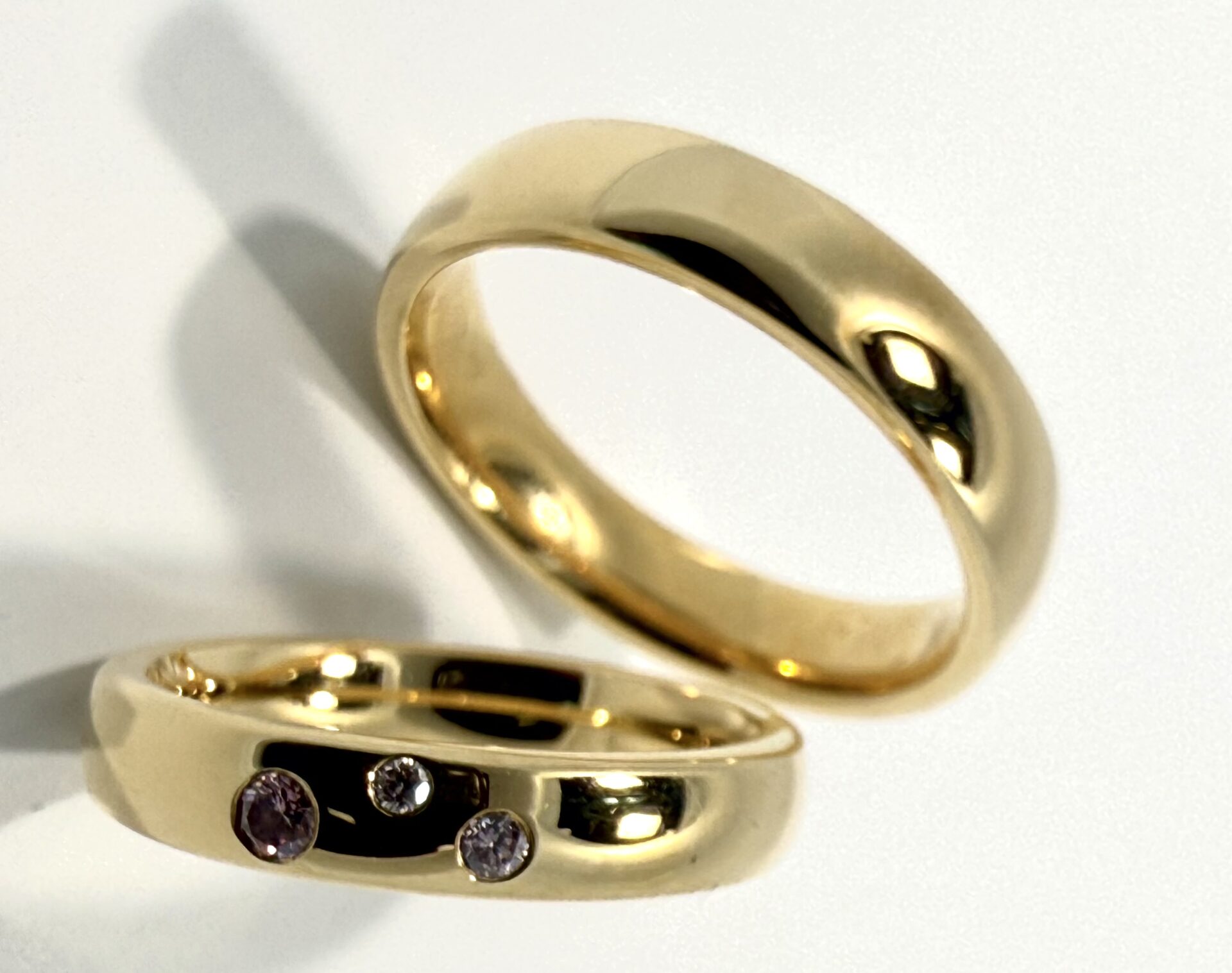 Eheringe in besonderen Farben und feiner Harmonie In Roségold und Sattgold strahlt die zarte Kombination farblicher Harmonie in außergewöhnlichem Glanz Hochglanzpoliert, filigran und hauchzart sind die feinen Nuancen des Farbverlaufes sensibler Wahrnehmung Purpur leuchten die drei Diamanten im Brillantschliff mit 0,085 ct. in den Rosatönen: – faith – pink (Naturfarben) – purblish –